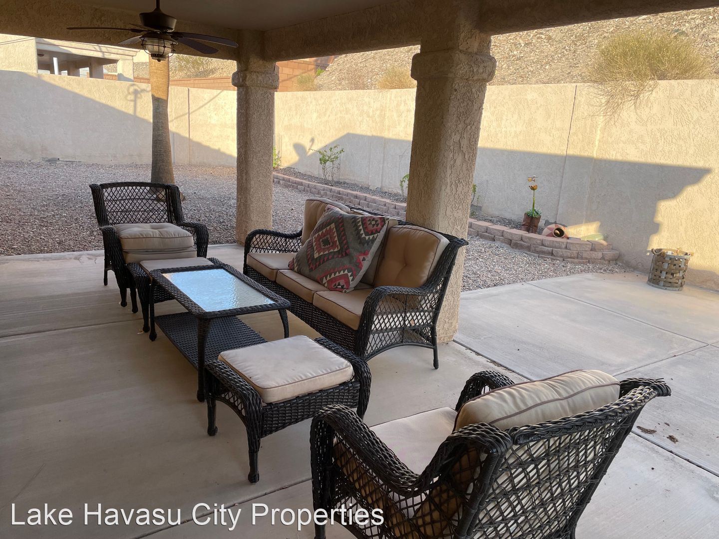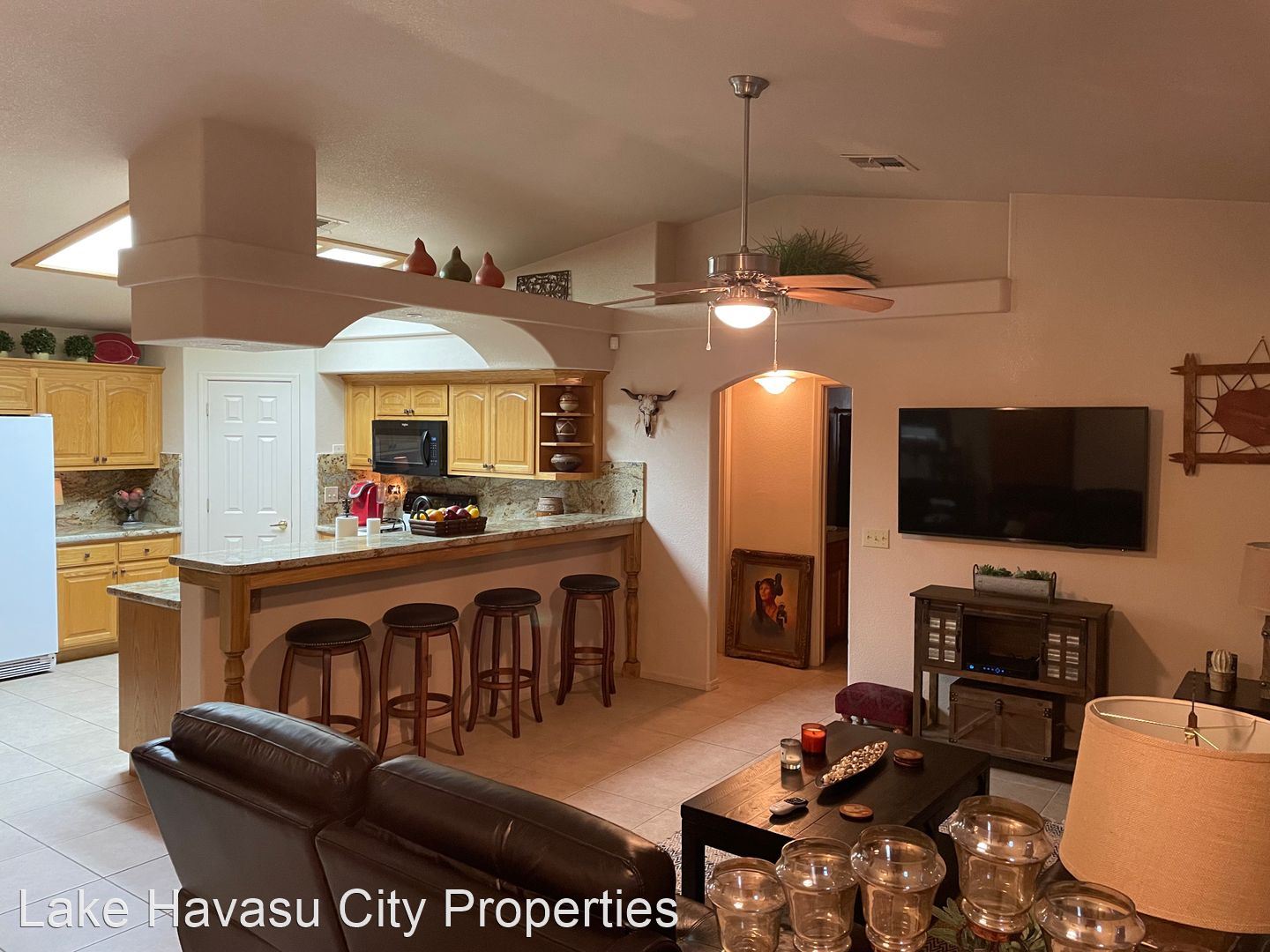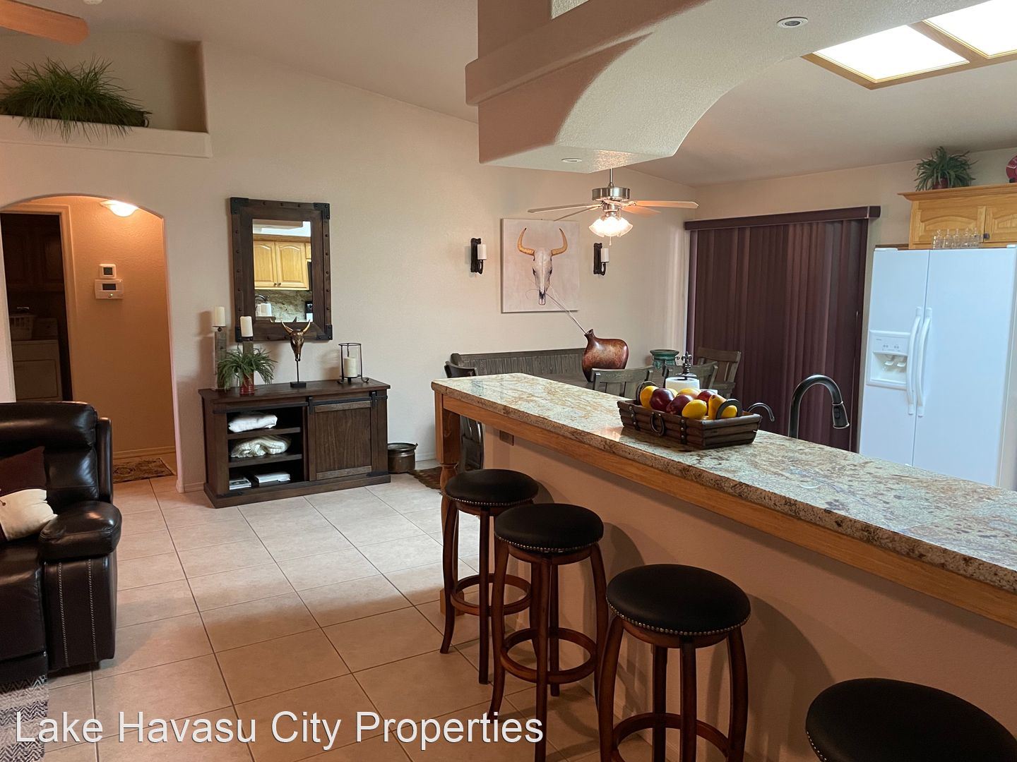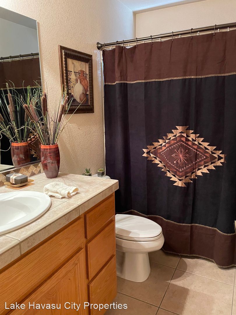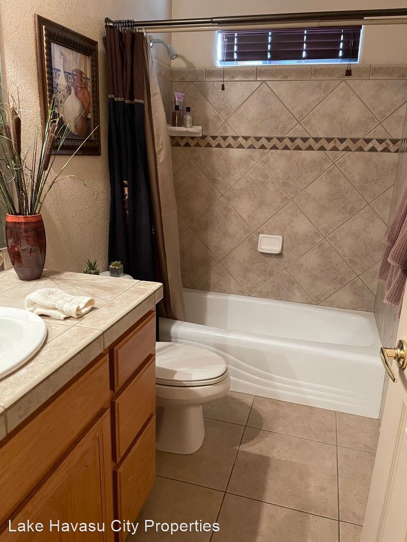 Furnished Winter Rental 2023-2024 - Available November-April 2023/2024. This gorgeous remodeled and updated furnished Winter Rental is located on the Southside of Havasu. Close to Hwy 95, Sarah's Park (where many of the Winter festivals are hosted!), The Skate Park, Race Track and so much more! This home features tilde floors through out, granite countertops, open kitchen, dining and living room concept. Vaulted ceiling in living room and master bedroom. Master bedroom features a king size bed, tiled walk in shower with separate soaking tub. Large master closet. Fenced back yard, large covered patio, patio furniture and barbecue pit available. Elegantly decorated through out! Cable provided, No Internet. $100 cap on electric. We require an application prior to showing, apply online at www.havasurentalhome.com No pets! Ask for Liela