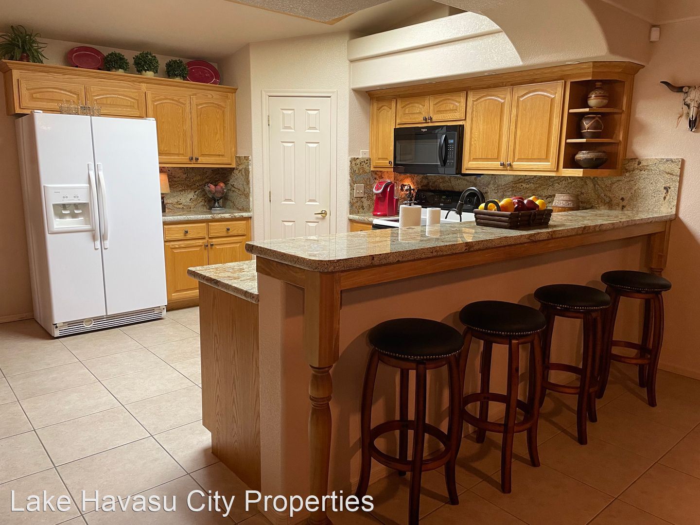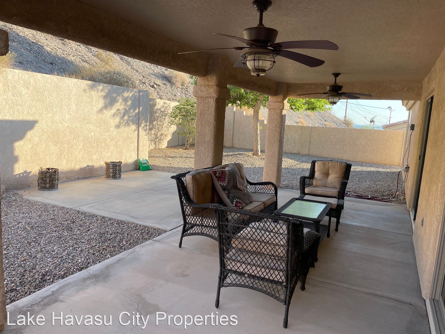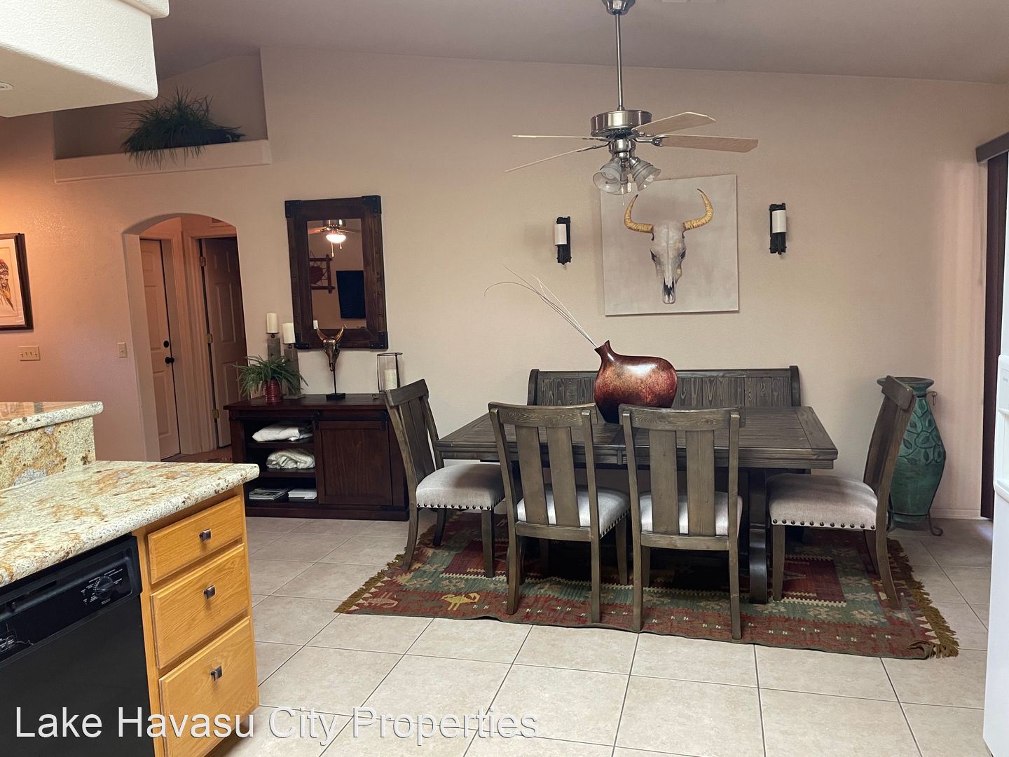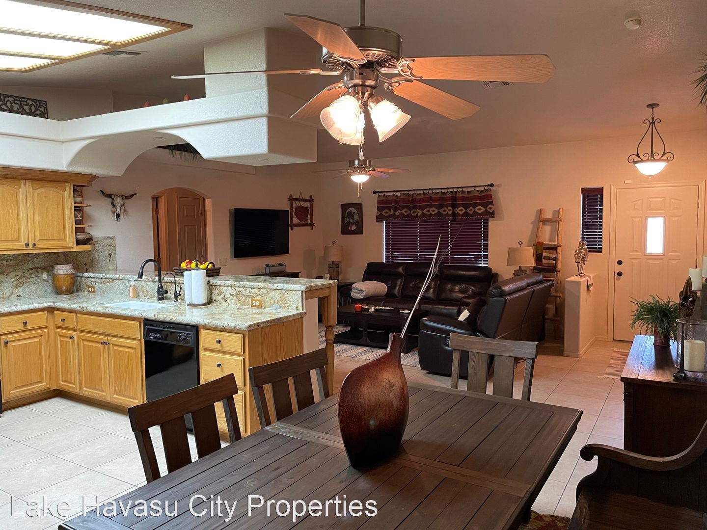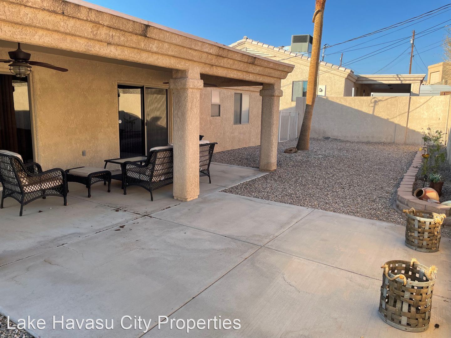Furnished Winter Rental 2023-2024 - Available November-April 2023/2024. This gorgeous remodeled and updated furnished Winter Rental is located on the Southside of Havasu. Close to Hwy 95, Sarah's Park (where many of the Winter festivals are hosted!), The Skate Park, Race Track and so much more! This home features tilde floors through out, granite countertops, open kitchen, dining and living room concept. Vaulted ceiling in living room and master bedroom. Master bedroom features a king size bed, tiled walk in shower with separate soaking tub. Large master closet. Fenced back yard, large covered patio, patio furniture and barbecue pit available. Elegantly decorated through out! Cable provided, No Internet. $100 cap on electric. We require an application prior to showing, apply online at www.havasurentalhome.com No pets! Ask for Liela